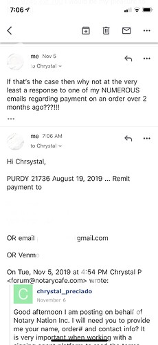 Update: Several emails, messages, 2 voicemails, post on Notary Cafe later … payment has been received. Thank you Chrystal for paying me on an order that was closed on August 19, 2019. She says payment wasn’t due until November 19, 2019 … Funny … I had another order prior to this I had inquired payment on and was told net 45 days via email, hence why I waited until October to reach out on this order … anyway payment received just a few moments ago. Case closed.